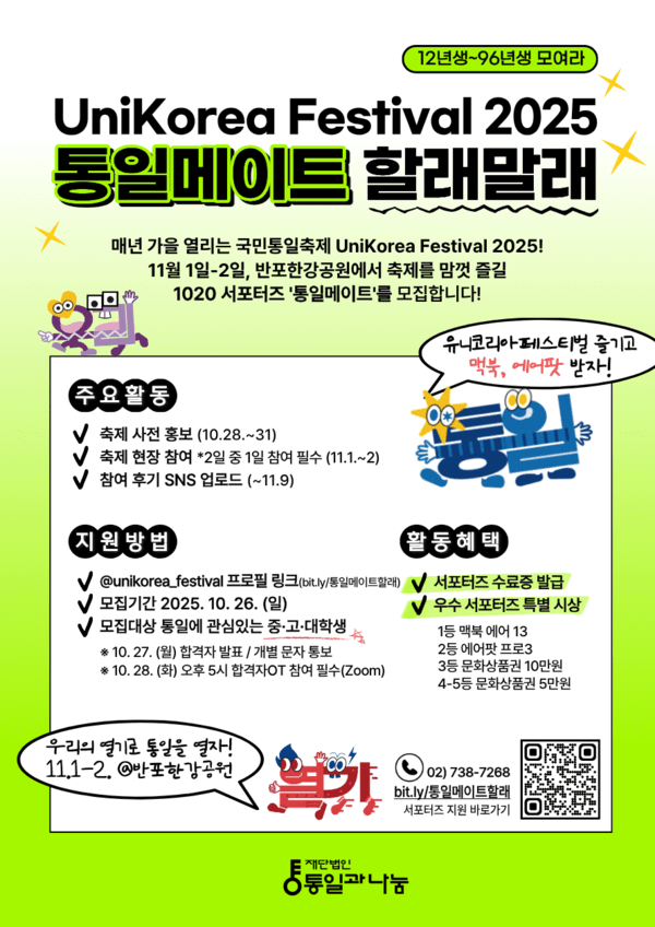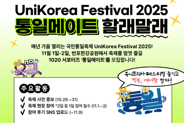 재단법인 통일과나눔이 다음 달 1일부터 2일까지 서울 반포한강공원에서 열리는 ‘UniKorea Festival 2025’를 앞두고 공식 청년 서포터즈 ‘통일메이트’를 모집한다.