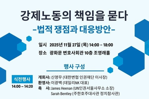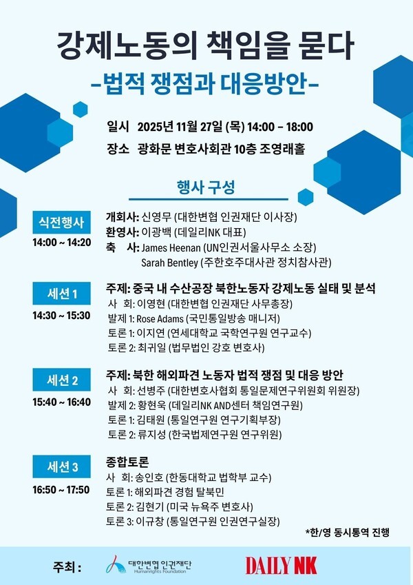 행사는 27일 오후 2시부터 6시까지 광화문 변호사회관 10층 조영래홀에서 진행된다. 대한변협 인권재단과 데일리NK가 공동 주최하며, 해외 전문가 참여를 고려해 한·영 동시통역도 제공된다.