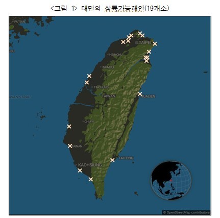 서해안의 전체길이는 약 1,250km에 이르고(부속도서 제외), 이 중 양륙에 충분한 폭과 경사를 가진 해안구간이 여러 곳 있지만, 그 개소는 매우 한정적이다. 대만군과 해외 연구소들은 <그림 1>과 같이 대만 본섬의 상륙가능해안을 약 19개소로 추정하고 있으며, 이 지역 대부분은 평야지대와 연결된 해안이다.7)