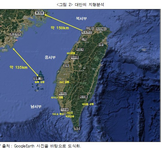 특히 수도 타이베이와의 근접성으로 인해 내부 주요시설 파괴, 지휘통제체계 혼란 등 전략적 기습효과를 획득할 수 있는 지역이다. 둘째, 타오위안은 대만 중북부에 위치하며 직선형 해안과 완만한 사질 지형이 부분적으로 분포해 있다. 위성사진 분석결과, 약 1.63km의 상륙가능해안이 식별되며 대대급 이하 제대의 상륙에 적합한 조건을 제공하고 있다.