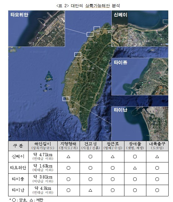 <표 2>와 같이 대만 본섬의 서해안 지역 상륙 가능해안은 총 4개소로 신베이, 타오위안, 타이중, 타이난 해안 등이 있다.