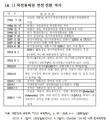 전작권 문제 논의 및 합의 경과: 1950년 이승만 대통령의 한국군 작전지휘권을 유엔군사령관에게 이양에서부터 지금까지 전시작전통제권의 변천 역사는 아래 [표 1]과 같다.